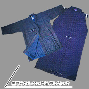正藍の剣衣・袴はなるべく色を落とさず様、ひと晩ぬるま湯につけ、押し荒いをするだけで汗を抜き、そのまま日陰に干して下さい。剣衣は脱水にかけても大丈夫です。