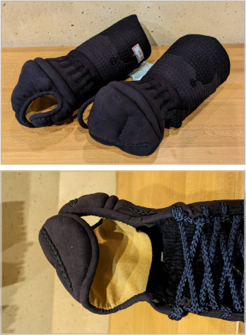 手首をマジックテープで止めます。 籠手の臭いが手に付かないので清潔。汗を吸収するので、手の内の皮が長持ちし、籠手自体もとても長持ちします。店主波多野登志夫も愛用し、竹刀を握る感触に違和感はありません。 |